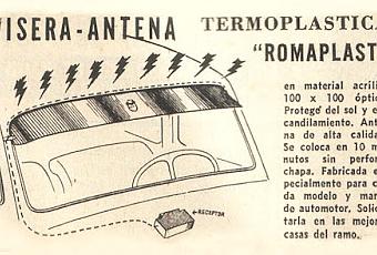 Ahora en una época donde el parabrisas con antena incorporada para la radio era ciencia ficción, apareció la visera Romaplast de acrílico. Que era visera y antena a la vez en el año 1969 en Argentina. El fabricante no figura en el aviso, pero sí anuncia que se podía adquirir en las casas especializadas del ramo.