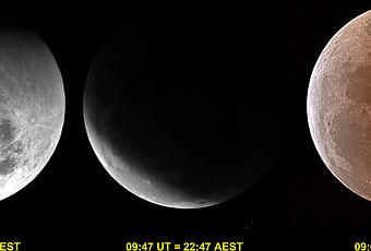 Tres tomas del eclipse total de Luna que fue visible en medio mundo el 8 de octubre de 2014. Las conseguí entre nubes desde el jardín de mi casa en Sydney usando mi telescopio, un Skywatcher Black Diamond D = 80 mm, f = 600 mm, con una cámara CANON EOS 600D acoplada al foco primario. La imagen de la Luna Roja es el resultado de apilar 40 tomas independientes, todas conseguidas a velocidad 1/3s y 800 ISO. El apilado se hizo con el software Lynkeos, aunque el resto del procesado se llevó a cabo con Photoshop. Crédito: Á.R.L-S. (AAO/MQ)