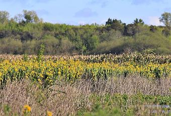 Humedal invadido por lirio amarillo (especie exótica), al fondo vista de la selva