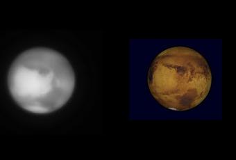 A 96 millones de km, brillando en la constelación de Cancer, se encuentra Marte. Un planeta bastante más pequeño que la Tierra pero que tiene tanto en común y que tanto ha inspirado a científicos y soñadores. Schiaparelli, uno de los observadores más experimentados y precisos, vio los famosos canali, simplemente líneas sobre el terreno con origen natural. Esta imagen la he tomado con filtro IR Pass en una noche con bastante turbulencia. Adjunto el modelo obtenido por Cartes du Ciel para reconocer formaciones y estructuras de la geografía marciana.