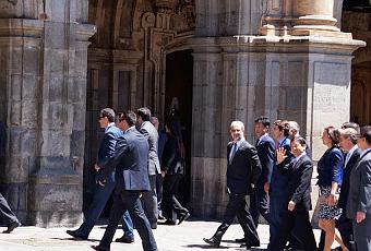 Ha visitado la Universidad, la Catedral y desde allí ha paseado hasta la Plaza Mayor tras saludar a un grupode estudiantes japoneses se dirigió hasta el ayuntamiento donde ha recibido las llaves de la ciudad. Tras realizar el acto con el Alcalde en el ayuntamiento salio al balcón de la Plaza donde pudimos verle. Tras la visita a la Plaza se dirigió hasta Fonseca donde comió con el Alcalde y otras autoridades antes de las visitas que tenia que hacer en la tarde.