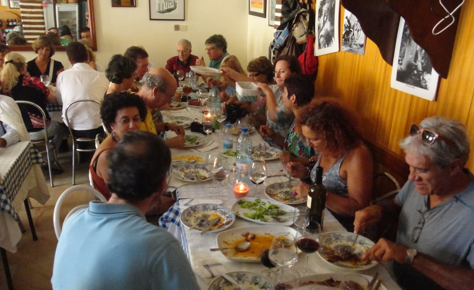 La visita a Arraiolos ya merece todo un día de admirado deambular, pero nuestro coordinador -Diamantino Vasconcelos- nos tiene preparada más tarea para este día que ha comenzado… ¡frío!, y nos hace añorar alguna manteleta para la espalda, si bien enseguida cambiará. Ya cambia cuando subimos al Castelo de la población, edificado en el siglo XIV por orden de D. Dinis, con singular muralla elíptica, que sigue las curvas de nivel del promontorio donde se ubica y desde el que se contempla la gran planicie alentejana de alrededor, que nos conduce al oeste hacia Montemor-O-Novo, al este hacia Estremoz, al norte a Mora y al sur a Évora, que será el punto final de nuestro periplo.COMIDA EN AZARUJA.Antes, como ha llegado la hora de comer, probamos un lugar nuevo para muchos de nosotros: el restaurante O Bolas, de Azaruja, entre Evoramonte (a donde enseguida nos encaminaremos) y Évora.