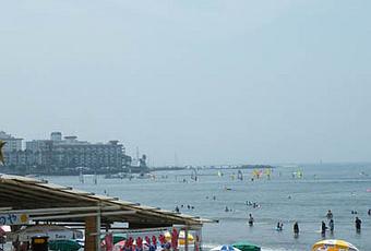 Estamos cansados como ya hemos dicho, así que decidimos dirigir nuestros pasos, bueno, nuestras pedaladas, hacia la playa de Kamakura. Esta localidad cuenta con dos playas, Yuigahama Beach y Zaimokuza Beach, nuestro paseo discurre por ambas. Es verano, hace calor y la playa está sorprendentemente llena. Nos llama la atención el contraste de la cantidad de gente que van siempre tapados hasta arriba y las mujeres que usan paraguas para evitar el sol y ver ahora aquí un montón de gente en bañador tomando el sol y paseando por la playa al más puro estilo español. De hecho la playa nos ha recordado mucho a casa, arena fina, mucha gente jugando a las palas o al balón y chiringuitos, montones de chiringuitos donde sentarte a comer o a tomar algo fresquito. Sólo nos había faltado que nos hubieran puesto paella para comer.