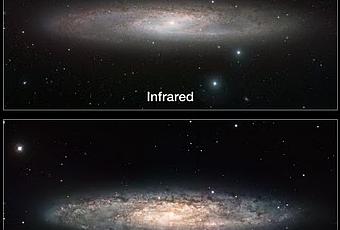 Imágenes Infrarroja / óptica que compara dos perspectivas de la galaxia del Escultor. (Crédito: ESO / J. Emerson / VISTA. Reconocimiento: Cambridge Astronomical Survey Unit)Desde el Observatorio Paranal en Chile se ha tomado una imagen nueva y espectacular de la galaxia Escultor (NGC 253) con el telescopio del Observatorio Europeo Austral VISTA como parte de una de sus primeras campañas de observación importantes. La imagen infrarroja de VISTA se ve menos afectada por el polvo y revela una miríada de estrellas más frías, así como una barra prominente de estrellas en toda la región central. La imagen de VISTA aporta revela nuevos datos sobre la historia y el desarrollo de la galaxia.
