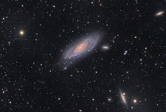 El campo de visión telescópica de dos grados de anchura apunta a la constelación Canes Venatici, cerca del asa de la Osa mayor. También conocida como NGC 4258, M106 es el miembro más grande del grupo de galaxias Cannes II; tiene unos 80.000 años luz de diámetro y se encuentra a 23,5 millones de años luz de distancia. Para una galaxia lejana, la distancia a M106 es bien conocida en parte porque se puede medir directamente mediante el seguimiento de su notable máser o emisión láser de microondas. La emisión máser, muy rara pero de origen natural, está producida por las moléculas de agua que hay en las nubes moleculares que orbitan el activo núcleo galáctico. La escena incluye otra importante galaxia espiral que se ve casi de canto: NGC 4217 (abajo a la derecha de M106). La distancia a NGC 4217 es mucho menos conocida; se estima que es de unos 60 millones de años luz.