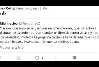 Me encanta las críticas que hace Mientrasleo de la crítica "profesional", esa crítica que reseña libros para periódicos y revistas especializadas. Me gusta tanto, que he decidido hacer mi TFG sobre ello. Pregunta: ¿vosotros leéis este tipo de crítica? Yo, es que no puedo. Es lo que dice Mientrasleo, se llenan la boca de palabros que no entiendo, usan una prosa compleja y se enredan en sus propias palabras. De verdad, que lo he intentado, pero es que me pierdo y no sé si recomiendan el libro o no. Además, intentan ser siempre tan objetivos e imparciales, que termino de leer esas reseñas sin estar segura de si realmente han leído o no y qué han sentido al leerlo. No ho sé, en caso de que sí leáis este tipo de crítica, ¿me recomendáis la de alguna publicación en particular?
