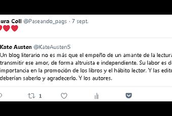 Me parece precioso este mensaje de Kate Austen. Sin duda, los blogs literarios son unos grandes promotores de la lectura, y lo hacen por placer, por pasión, porque les apetece. A ver, eso de que sean altruistas e independientes, puede que no sea verdad en todos los casos, porque hay algunos bloggers que reciben libros (pero eso no hace que por ello sean menos sinceros), pero lo que les hizo empezar en este mundillo fue el amor por la lectura. Y aunque tampoco creo que las editoriales y autores tengan que agradecer el trabajo de los bloggers (pues lo hacen porque quieren), creo que últimamente se les reconoce muy poco su labor y son menospreciados (hay editoriales que solo envían libros a los que tienen Instagram, por ejemplo), en especial por los medios de comunicación, que destacan a los booktubers y bookstagrammers y se olvidan de nosotros. ¿Qué opináis?