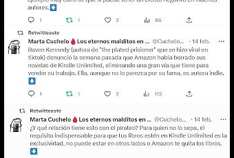 Me sorprendió mucho lo que cuenta Marta Cuchelo sobre lo que le sucedió a Elisa Kova y Raven Kennedy. Por supuesto, sabía que el pirateo perjudicaba a los autores, pero pensaba que era solo a nivel de ventas. No conocía esta cláusula de exclusividad de Amazon y tampoco imaginaba que, en caso de piratería, también se aplicara, por lo que pueden borrarte la cuenta. Suerte que las autoras lograron aclarar el asunto.A ver, G me conoce y tiene acceso a mis listas de deseos, pero mi madre no, por lo que si salgo de compras con ella en Navidad o en una fecha próxima a mi cumpleaños, la nota muy atenta a todas mis palabras, en busca de un buen regalo. Por mi parte, antes del cumpleaños de G, pese a que también sé qué libros quiere, sí que hago lo que dice Randy Meeks, y estoy atenta a lo que dice G; a ver si logro encontrar algo que le sorprenda. ¿Vosotros hacéis lo mismo?