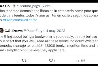 Como sabéis, el blog está en varias redes: en Twitter, en Facebook, en Instagram, en The Storygraph, en Goodreads y en Bloguers (podéis acceder a mi perfil de cada red social haciendo click en los enlaces), pero estoy especialmente activa en Twitter, Facebook e Instagram, por lo que en esta sección me centraré en esas redes sociales. Repito, como en cada ocasión, que la idea de esta sección no es completamente mía (siempre hay que dar créditos). Me inspiré en una sección muy parecida en el blog de Deja volar tu imaginación llamada Citando a Twitter. En ella, Patt recopilaba algunos de sus retweets favoritos, aunque siempre están relacionados con reflexiones sobre el mundo en general, no centradas en el ámbito literario. Y sin más dilación, os dejo con la entrada:Visto en TwitterMe siento muy identificada con lo que dice C. G. Drews. Todo lector cree sinceramente que algún día tendrá tiempo para leer el montón de pendientes que se acumula en sus estanterías, como si el tiempo o la mortalidad fueran un constructo y no un factor importante. Tenemos suficientes libros en nuestras estanterías como para varias vidas, y aun así, seguimos comprando. ¿No os entristece pensar en los libros que tenéis y que jamáis podréis leer?