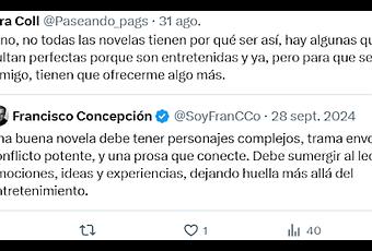 Como siempre digo, no estoy en contra de la novela de entretenimiento, así que no creo que todas las novelas tengan que ser tal y como las describe Francisco Concepción; solo aquellas que pretenden ser algo más que entretenimiento. Sin duda, una novela así, se quedará conmigo.