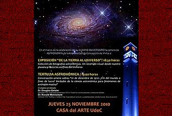 En el marco de la celebración de su cuarto aniversario, la carrera de Astronomía de la Universidad de Concepción te invita a la exposición "De la Tierra al Universo" y una tertulia astronómica sobre el 21 de diciembre de 2012.