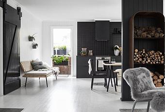Las paredes, se encuentran revestidas por taclas de madera lacadas en blanco, al igual que el suelo. Contrastan con ellas, la puerta corredera de granero en color negro, los pequeños azulejos de 10x10 que revisten parte de la cocina y los muebles de la cocina, también en negro.