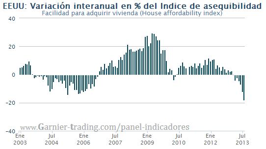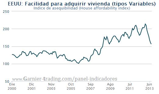 El HOUSE AFFORDABILITY INDEX representa lo fácil ó difícil que tiene un hogar medio americano el adquirir una vivienda media a través de una hipotecia media, en este caso a tipo variable.