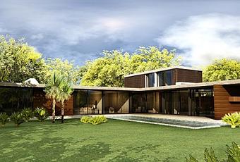 Tiene una volumetria simple y compacta, con planta en forma de "L" , que abraza a una piscina rectangular, la casa esta ubicada en una barrio residencial cerrado, con hermosa vegetacion y vistas