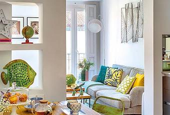 Los textiles son los verdaderos protagonistas de la vivienda, aportando ese aire fresco y juvenil que reina en la casa. Estampados en tonos turquesas amarillos, azules y rojos bien conjugados entre si, sobre una base en una gama cromática en tonos neutros que ayuda a reflejar la luz y crea continuidad visual, dando una mayor sensación de espacio.
