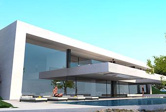 Grandes ventanales exteriores, apostando por el vidrio y la piedra caliza blanca, acompañados por un inmensa pérgola que ofrece sombra a los porches de la vivienda tanto de los dormitorios en planta baja como al salón y comedor. Gran trabajo por parte del estudio en lo que se refiere al paisajismo, diseñando montículos a lo largo del terreno para dar sensación de movimiento con las ondulaciones.