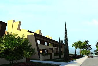 Con estas características conceptuales se distribuye en bloques de 8 viviendas unifamiliares, 4 de tres dormitorios y 4 de dos dormitorios.