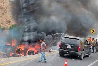 Desafortunadamente, el tráiler pronto fue envuelto en llamas. Las unidades de emergencia, incluyendo **elementos de la Guardia Nacional** y vehículos de extinción de incendios, llegaron rápidamente al sitio, trabajando en sofocar el fuego y asegurar la zona.