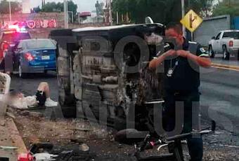 San Luis Potosí.- Un aparatoso accidente se registró en la intersección de Salvador Nava y Manuel Nava, donde una camioneta de la marca Kia volcó tras impactarse contra un objeto fijo, dejando un saldo de dos personas lesionadas.