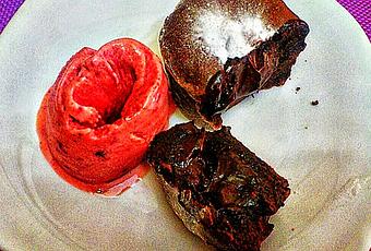 Recién sacado el volcán del horno lo desmoldamos sobre un plato y le ponemos el helado, hay que servir el volcán caliente, para aprovechar la crema de chocolate de dentro.
