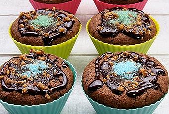Ingredientes:Para la masa de los volcanes:- 100 grms de chocolate fondant (mínimo del 70% de cacao).- 100 grms de mantequilla a temperatura ambiente.- 200 grms de azúcar.- 4 huevos.- 50 grms de harina.- 1/4 cucharadita de bicarbonato.- Una pizca de sal.Para el glaseado:- 75 grms de chocolate fondant (mínimo del 70% de cacao).- 25 grms de mantequilla.- 1 barrita de chocolate y caramelo (Fudge de Cadbury) o una barrita de Crunch.- Azúcar de colores.
