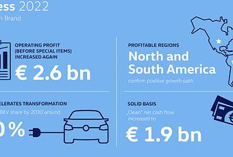 A pesar de la disminución de las entregas, la marca generó ventas anuales de 74 mil millones de euros (año anterior*: 68 mil millones de euros) gracias a un modelo y una política de precios optimizados. Además, la marca reforzó su base financiera, mejorando el flujo de caja neto "limpio" en 2022 a 1900 millones EUR (300 millones EUR * ). La optimización de costos fijos y gastos de distribución estuvo entre los factores que contribuyeron al buen resultado financiero.