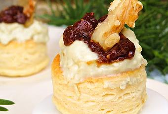 Esos están rellenos con queso roquefort, manzana y como punto dulce mermelada de higos, el toque crujiente, aparte de los volovanes, lo ponen las nueces.
