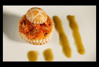 Cuando los pimientos estén asados, retira los tallos y las pepitas. Colócalos en una jarra y tritura con una batidora eléctrica. Rellena los volovanes con el ajoarriero y salpica el plato con la salsa de pimiento verde.