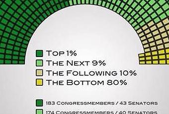 En el gráfico de abajo, que pertenece a la distribución de la riqueza financiera en los Estados Unidos en miembros del congreso y el senado, vemos que la gran mayoría (en verde claro y oscuro) pertenece al 10% más rico. Sólo el 15% de los miembros de la cámara de representantes y del senado pertenecen al 90% más pobre.