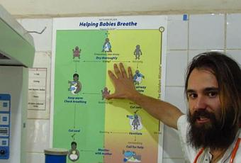 Como por arte de magia, un llanto nos llena de alegría. Pero es débil. Tomamos ahora la bolsa con mascarilla ajustando de manera hermética la mascarilla con nuestras manos de manera que cubra bien su boca y nariz, y apretamos la bolsa con nuestra mano para insuflar aire en sus pulmones.
