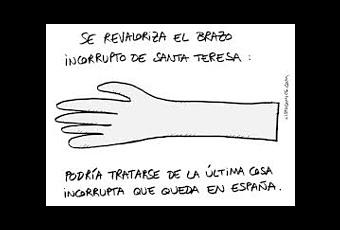 Por esa razón, este blog, crítico y defensor acérrimo, durante la última década, de la democracia auténtica y la decencia política, además de recomendar, como otras veces, el voto en blanco, tradicional signo de protesta frente a los partidos y sus programas, el voto nulo con una frase de rechazo incluída en la papeleta o la abstención activa, una forma evidente de deslegitimar el abuso y la corrupción, recomienda a los que siempre votan que en las próximas elecciones lo hagan por el brazo incorrupto de Santa Teresa de Jesús, una de las pocas cosas que quedan en España que no han sido podridas y pervertidas por la corrupción.