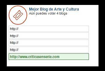 Críticas en Serie está en la categoría de Arte y Cultura.Solo hay que introducir la dirección (url) en una de las cinco opciones de voto que Bitácoras permite para cada categoría (podéis votar más blogs, claro, y hay muchas categorías) y darle a VOTAR.