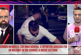 Durante la noche electoral del 26-M, cuando el periodista David Moreno, reportero del programa 'Todo es Mentira', de la Cuatro, se disponía a preguntar a la candidata Rocío Monasterio, de Vox, un militante de este partido le dio varios codazos en el abdomen y lo apartó literalmente a un lado de la calle. En su programa, Risto Mejide denunció la agresión al reportero. El partido de ultraderecha se había negado a acreditar al periodista y no le permitió entrar en la sede. Además de escuchar insultos e improperios de los simpatizantes que se encontraban frente a la sede, Moreno fue agredido por uno de ellos que le dio “varios codazos en la barriga” y lo apartó literalmente a un lado de la calle. “Estaba ejerciendo mi trabajo, aunque haya preguntas incómodas que no quieran oír”, denunció Moreno.La Asociación de la Prensa de Madrid (APM) manifestó su “condena sin paliativos” ante la agresión al periodista y recordó que “no es la primera vez que la APM ha pedido públicamente a Vox que evite llevar a cabo acciones que limitan los derechos a la libertad de expresión y de información, pilares fundamentales de nuestra democracia y cuya defensa compete de forma especial a los partidos políticos. Este comportamiento que denunciamos, como los vetos impuestos a varios medios de comunicación, van en contra del deber de los partidos políticos de someterse al escrutinio de la opinión pública, un ejercicio que se facilita a través del trabajo de los medios de comunicación en un marco de libertad de expresión y de respeto al derecho a la información. Por todo ello, conminamos a la formación política Vox a que no vuelva a cometer atentados contra el derecho a la información”. La Federación de Asociaciones de Periodistas de España (FAPE) asume y respalda el comunicado de la APM.