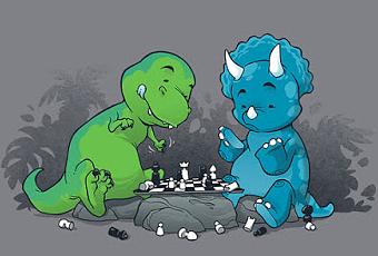 Traemos de nuevo a Koprolitos un diseño de camiseta del estudio DoOomcat, formado por la pareja de ilustradores canadienses Alison Acton y Jim Charalampidis. Ya vimos por aquí uno de sus diseños para ShirtWoot, y en esta ocasión nos muestran otro con los problemas que podrían tener un tiranosaurio y un triceratops ante una partida de ajedrez. Puedes conseguirla por algo más de diez dólares aquí.