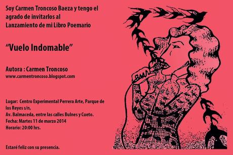 Invitación al lanzamiento de mi poemario "Vuelo Indomable", a efectuarse el día Martes 11 de Marzo de 2014, a las 20:00 hrs. en el Centro Experimental Perrera-Arte, la dirección es Parque Los Reyes s/n entre Bulnes y Cueto y un vinito de honor, para festejar la vida!