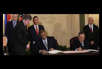 En la mañana de este martes 16 de febrero, se firmó en la sede del Hotel Nacional de Cuba, el Memorando de Entendimiento para el establecimiento de vuelos regulares entre Cuba y los Estados Unidos.Por la parte cubana, firmaron el Memorando el Ministro del Transporte, Adel Yzquierdo Rodríguez y el Presidente del Instituto de Aeronáutica Civil de Cuba, Alfredo Cordero Puig, mientras que por la parte estadounidense lo hicieron el Secretario de Transporte, Anthony Foxx, y el Secretario Adjunto para Asuntos Económicos y de Negocios del Departamento de Estado, Embajador Charles Rivkin.