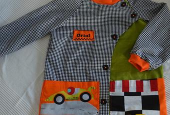 En esta he combinado la típica tela de cuadro de las batas con retalitos de tela que me había dado mi amiga Nuria. con un retalito del mercadillo.
