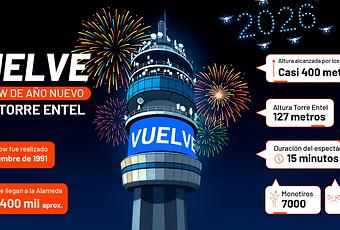Ya es oficial. La Torre Entel, edificio ícono del paisaje santiaguino, volverá a iluminar su cielo este Año Nuevo 2026. Fusionando tradición e innovación, el show más grande de la Región Metropolitana regresará después de 7 años con un renovado espectáculo que incluye drones y fuegos artificiales. Así lo confirmó la empresa de tecnología y telecomunicaciones Entel esta semana.