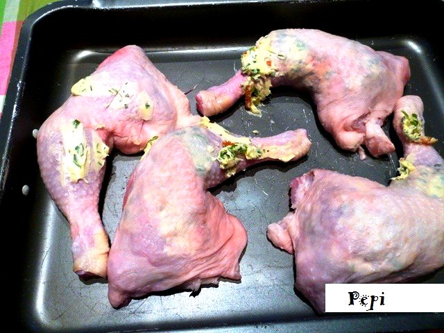 4.- Lavar y secar los muslos de pollo y con cuidado ir levantando la piel e ir untando con la mantequilla por debajo.