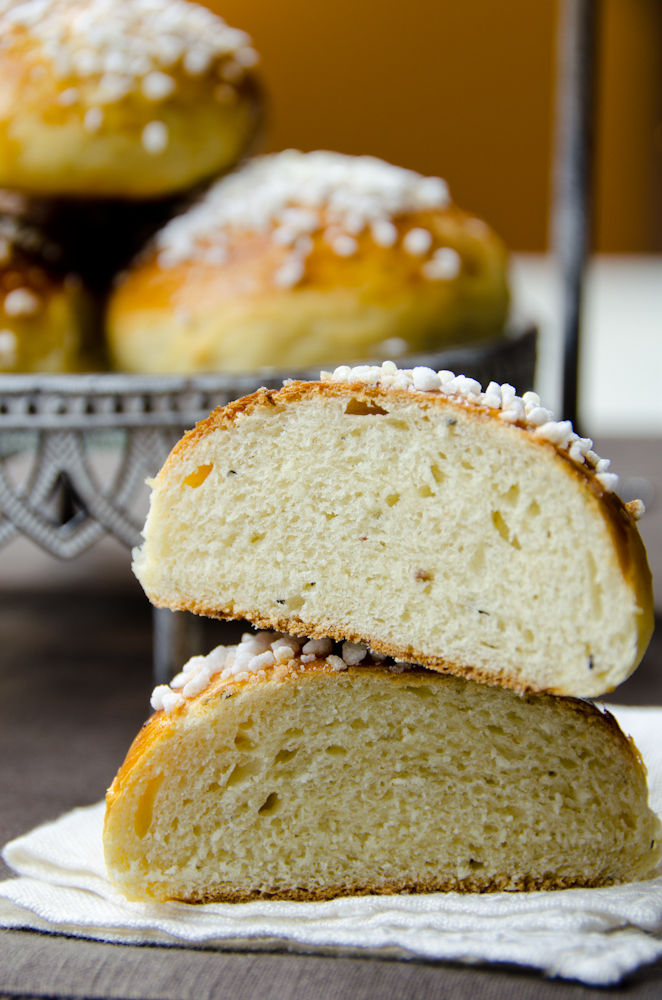 6. Pinta la superficie de los bollitos con el huevo batido que teníamos reservado y espolvorea con azúcar perla (aquí se dice que cuanto más, mejor).