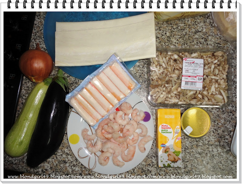 (para 2 personas)- Placa de hojaldre (con una del mercadona me bastó para 4 barquillas)- 1 cebolla- 1 berenjena- 1 calabacín- Media bandeja de virutas de setas y champiñones- 200ml de nata- 1 lata de atún- 2 puñaditos de gambitas- 8 palitos de surimi- Aceite- Sal
