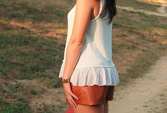 Llevo shorts de polipiel en marrón (una de esas prendas que Zara saca y que te enamoran año tras año) con camiseta de punto en banco y volantes de tela en el bajo. Como complementos opté por los tonos rojos-burdeos con el clutch y las sandalias pala. ¿Qué os parece el conjunto?