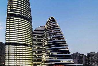 Este conjunto multifuncional que alberga locales comerciales y oficinas está ubicado en el subdistrito de Wangjing, un centro de tecnología para empresas como Telecom o Panasonic. Rodeado por 60.000 metros cuadrados de jardines, Wangjing Soho se compone de tres torres cuya forma sugiere la de una colina —la más alta de las cuales mide 200 metros— y de otros tres cuerpos más bajos que confieren continuidad al conjunto.