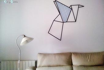 Igual que el original, usé washitape negro, y para rellenar una de las alas, washitape chevron azul y blanco.Me puse manos a la obra sin medidas ni nada. A ojo. Con la imagen en la pantalla del móvil y de pie en el sofá.A parte del washi, tuve a mano unas tijeras y un cúter.