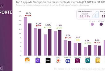 En cuarta posición aparece Moovit, con el 11,6% y una mejora del 4,5%, seguido de Madrid MBC, con el 6,7% y un descenso del 4,3%, Renfe Ticket, que se mantiene estable en el 5,8%; El Parking con el 4,7% y una subida del 17,5%; Telpark, con el 4,6% y una bajada del reach de 6,1%; y Free Now, con el 4,4% y una bajada del 20% en el reach.