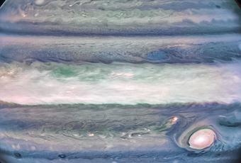 Si bien Júpiter es diferente de la Tierra en muchos aspectos (Júpiter es un gigante gaseoso, la Tierra es un mundo rocoso y templado), ambos planetas tienen atmósferas estratificadas. Las longitudes de onda de luz infrarroja, visible, de radio y ultravioleta observadas por estas otras misiones detectan las capas más bajas y profundas de la atmósfera del planeta, donde residen tormentas gigantescas y nubes de hielo de amoníaco.