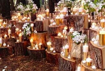 Con la caida de las hojas de los árboles se puede aprovechar para utilizar los elementos de la naturaleza para adornar un rincón del espacio donde vais a celebrar vuestro enlace. Como en esta foto en donde se utilizan troncos cortados de árboles juntos con muchas velas para formar un backdrop muy mágico y romántico de ceremonia exterior con el bosque de entorno. Aunque este mismo backdrop lo podríamos también utilizar en un interior si el entorno es rústico.