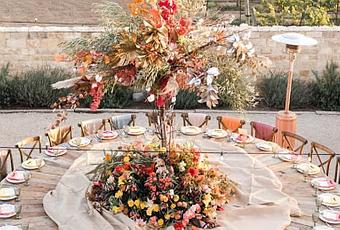 Nos encantó esta idea de montar para una boda pequeña una mesa enorme y redonda para sentar a todos los invitados. Un montaje de exterior que para bodas de otoño a primera vista es ideal por sus colores y por utilizar la madera en las sillas y mesas, y un centro simulando un árbol de otoño. ¿A qué diríais que es muy original y bonito? Pues sí, lo es pero no sé si os habéis fijado en todos los inconvenientes que tiene...