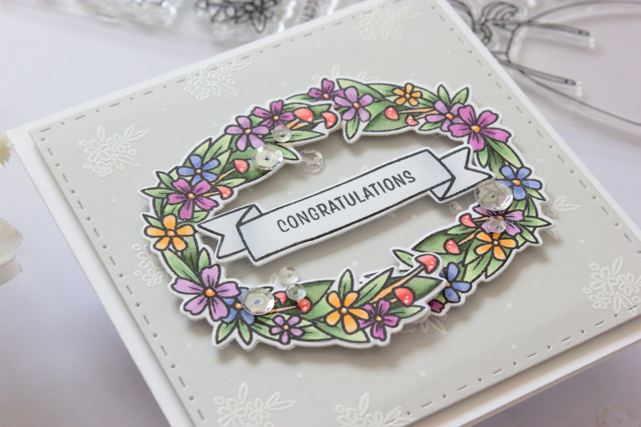 He usado uno de los sellos pequeños del set para crear un patrón. Simplemente he estampado las flores en un trozo de cartulina gris y las he embosado en caliente con polvo blanco. Después he estampado la media corona de flores dos veces con tinta negra y he coloreado ambas con rotuladores Copic.