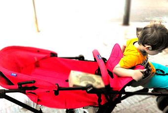 Pero esto ya es ir llamando la atención. Ahora cangrejín ha decidido que en la sillita se va sentado así, en el reposa pies, mucho más cómodo, vamos.